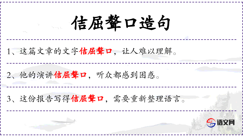 - 佶屈聱口:形容说话或文章晦涩难懂,不流畅。