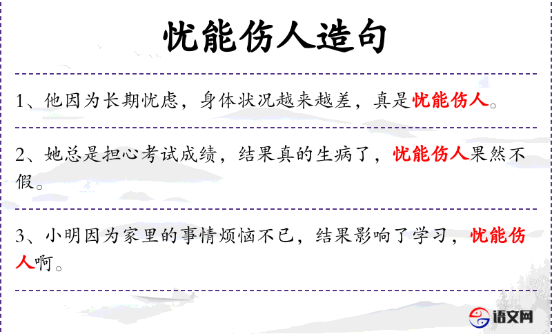 1. 【忧能伤人】 指忧愁会损害人的健康。