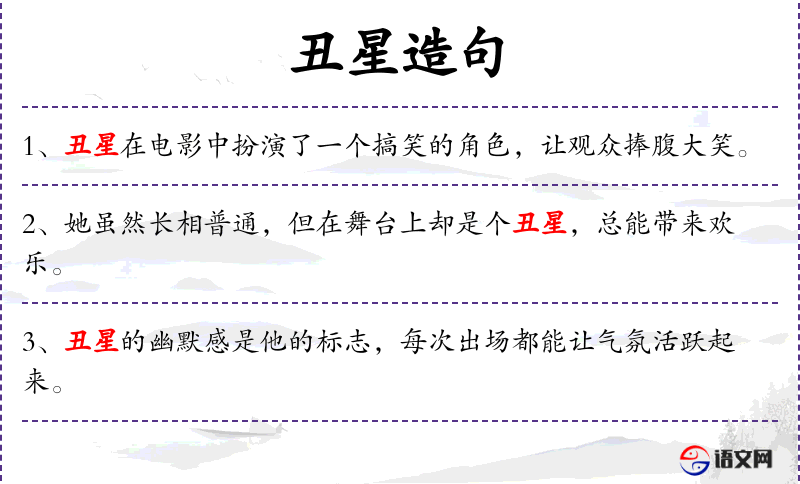 1. 【丑星】 - 指擅长演滑稽角色的著名演员,也指演技好而长相较丑的著名演员。