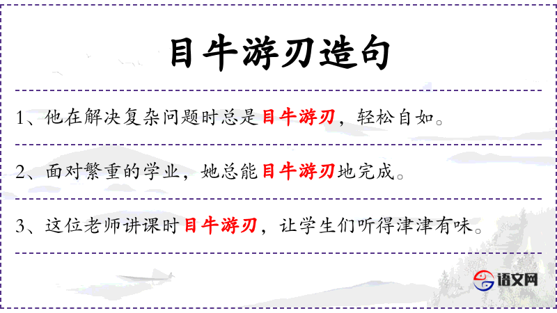 3. 【目牛游刃】 - 游刃:游刃有余。指技艺精熟,行事胜任轻松。