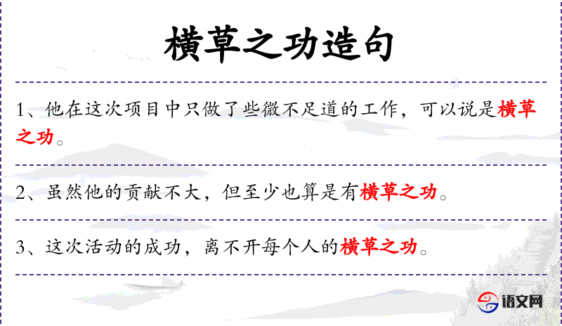 3. 【横草之功】 - 横草:把草踩倒。如同踩倒草那样的功劳。比喻功绩很小。