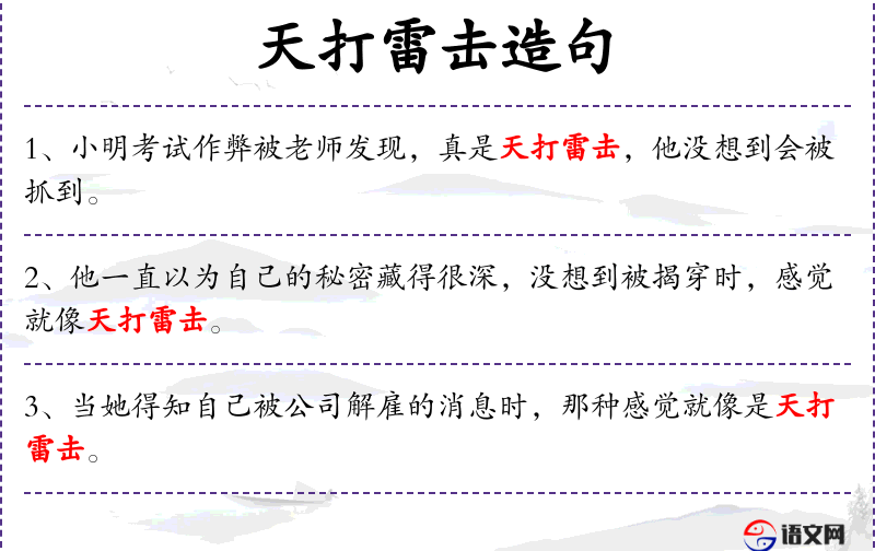 - 天打雷击:这个成语在**文化中常用来形容突然和强烈的震惊或打击,反映了人们对自然现象的敬畏和比喻能力。