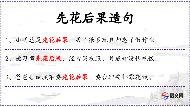 - 不先花后果:这个短语可能有些不清晰,但可以理解为“不要先考虑后果”或“不要先行动后思考”。