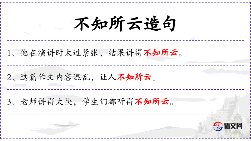 “不知所云”是一个常用的成语,反映了中文中对于表达清晰和逻辑性的重视。在不同的文化背景下,对于逻辑和清晰表达的要求可能有所不同。