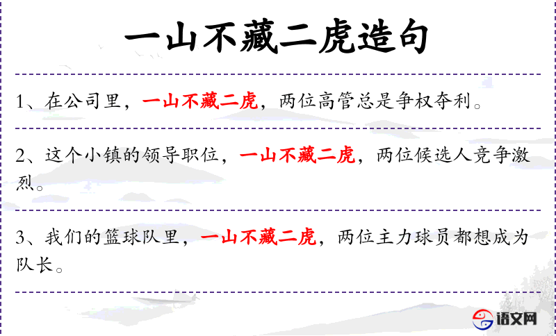 - 一山不藏二虎:这是一个成语,意思是同一个地方不能容纳两个强者,比喻两个人不能共存或互相竞争。
