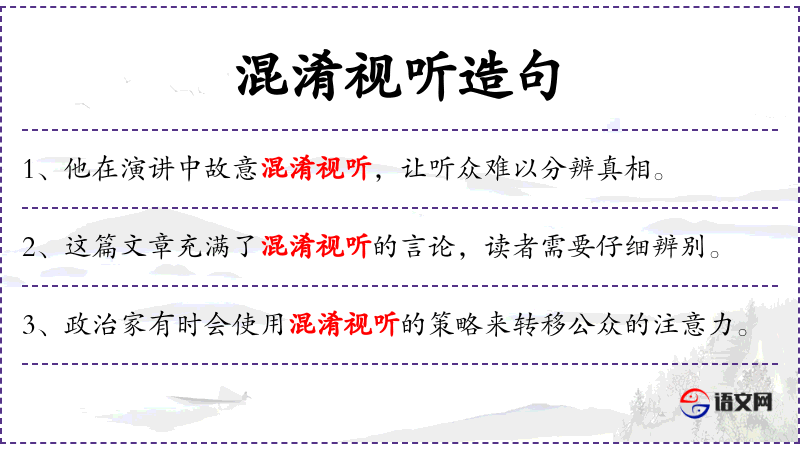 混淆:混杂。用假象或谎言让旁人分辨不清是非。