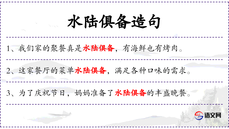 2. 【水陆俱备】 - 水:指水产,海味;陆:指陆产,山珍;俱:全。各种山珍海味都有。形容宴席上菜肴丰盛。