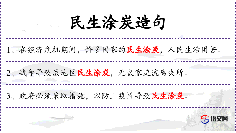 7. 【民生涂炭】 涂:泥沼;炭:炭火。人民陷在泥塘和火坑里。形容人民处于极端困苦的境地。