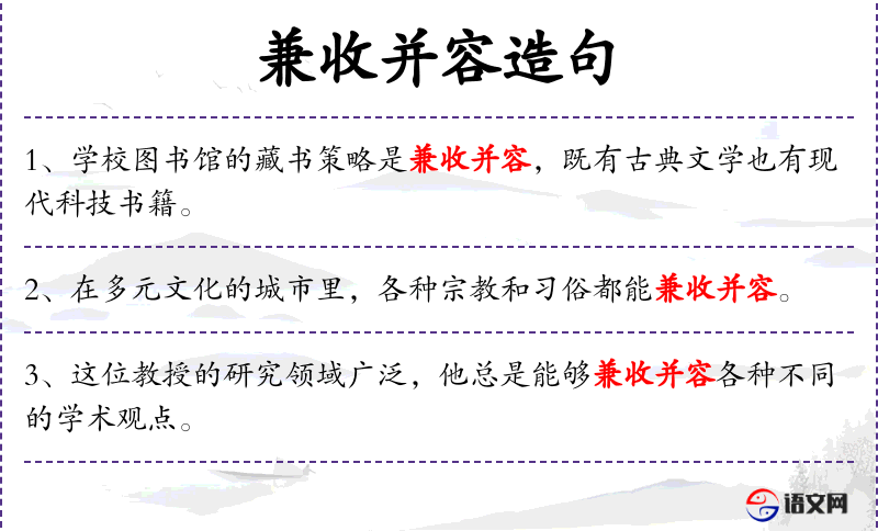 - 相关成语:“海纳百川”,意指包容广泛,与“兼收并容”有相似的含义。
