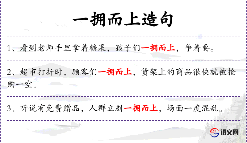 1. 【一拥而上】 一下子全都围上去。形容周围的人同时向一个目标猛挤过去。