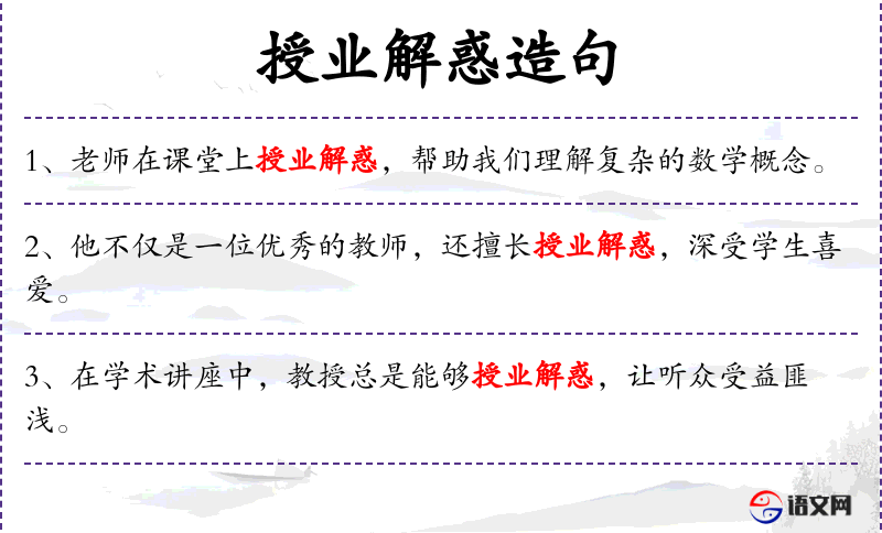 1. 【授业解惑】 授:教授,传授;惑:疑难。教授学业,解除疑难。