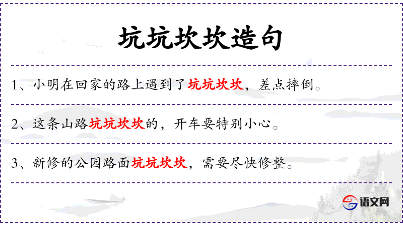 - 宾语:“坑坑坎坎”和“安全”