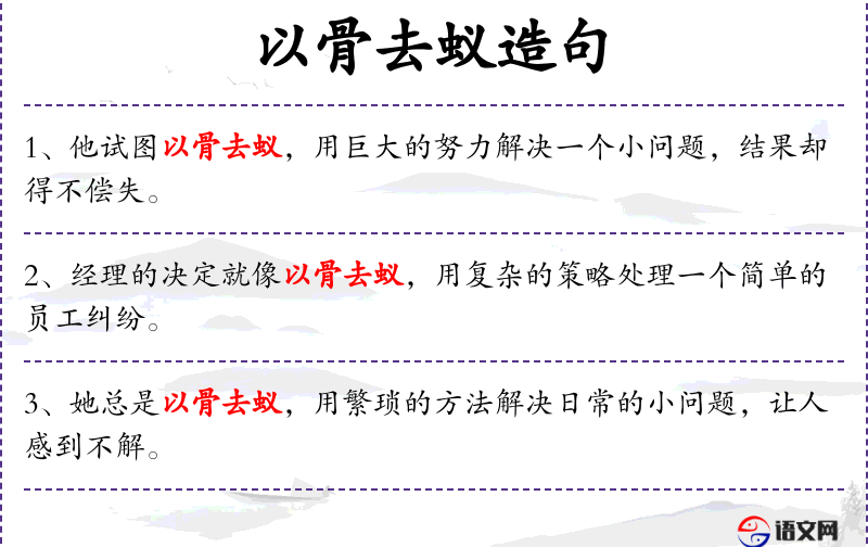 - 以骨去蚁:这个成语比喻用过度的手段处理小问题,反映了**文化中对于效率和合理性的重视。