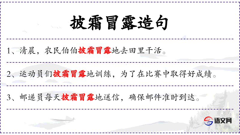 - 披霜冒露:形容在寒冷的天气中不畏艰难地工作。