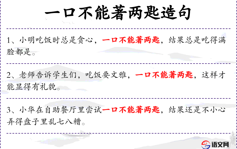 - “一口不能著两匙”是一个成语,源自《左传·宣公十五年》,用来告诫人们不要贪多嚼不烂。这个成语反映了文化中对于节制和适度的重要性的认识。