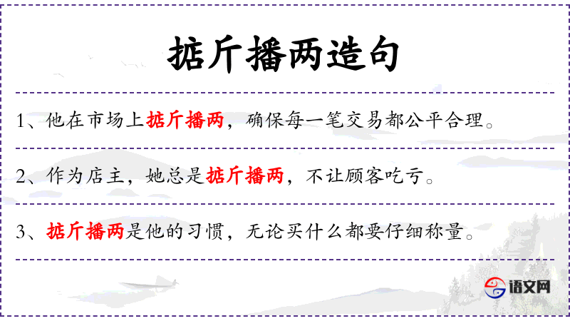 - 掂斤播两:这是一个成语,意思是仔细衡量,确保公平。