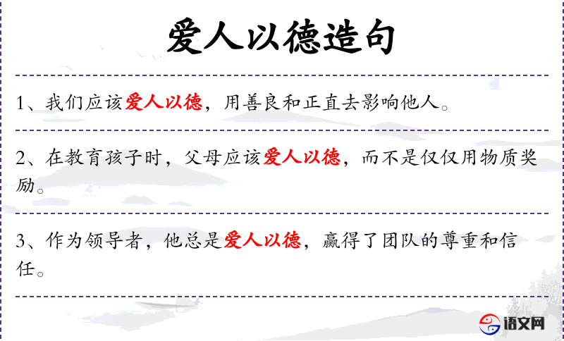 1. 【爱人以德】 - 爱人:爱护别人;德:德行。按照道德标准去爱护人。泛指对人不偏私偏爱,不姑息迁就。
