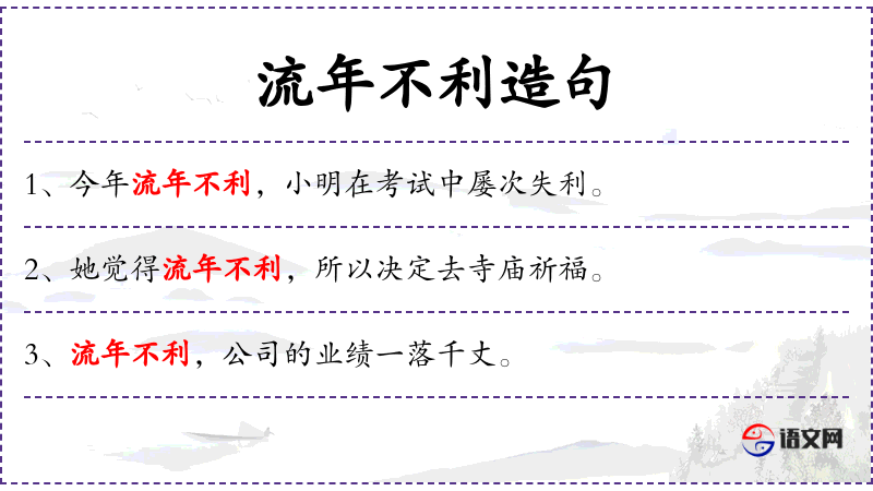 3. 【流年不利】 - 流年:旧时算命看相的人称一年中所行之“运”;利:吉利。指人长年里处于不吉利的状态。谓时运不佳。