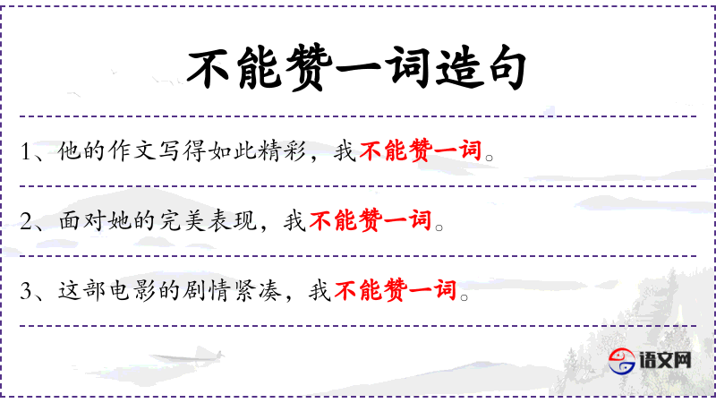 - 不能赞一词:表示对某事物非常满意,以至于无法用言语来赞美。