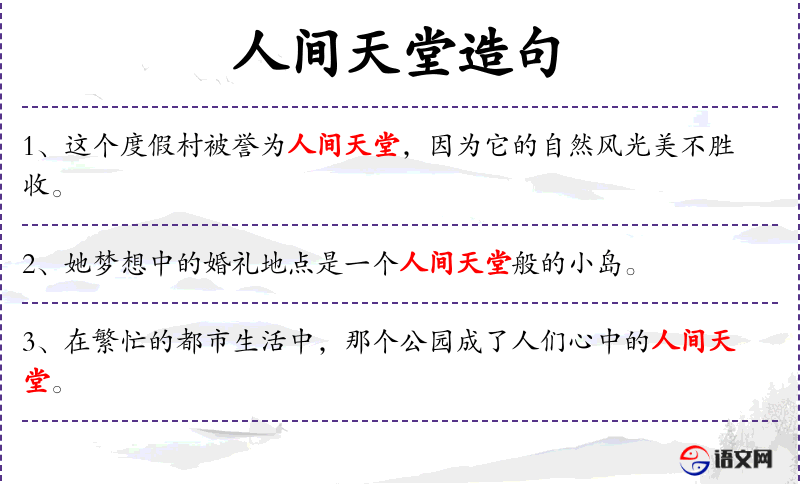 - 人间天堂:比喻非常美好的地方,如同天堂一般。