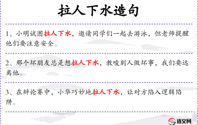 - 英文:使用“drag people into the mud”来表达“拉人下水”,“spread rumors”直接对应“散布谣言”。