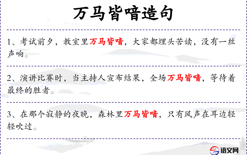 - 万马皆喑:这个成语来源于**文化,常用来形容非常安静的环境。