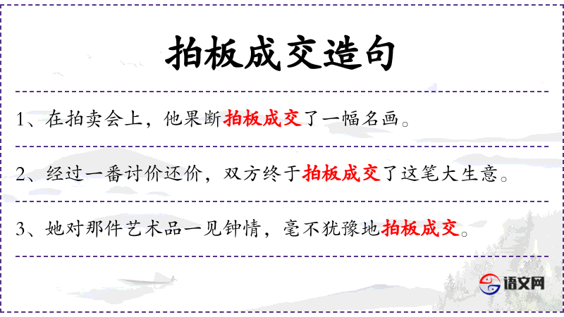 - 拍板成交:成语,形容迅速决定并完成交易。