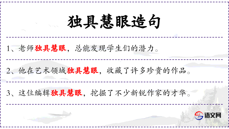 3. 【独具慧眼】 能看到别人看不到的东西,形容眼光敏锐,见解高超,能作出精细判断。