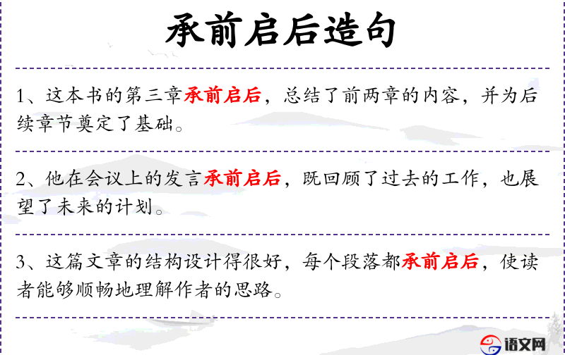 - 承前启后:指文章段落之间既有联系又有发展,前后呼应。