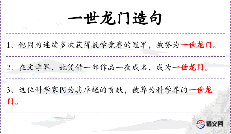 - 一世龙门:比喻在某一领域中地位显赫、影响深远的人物。