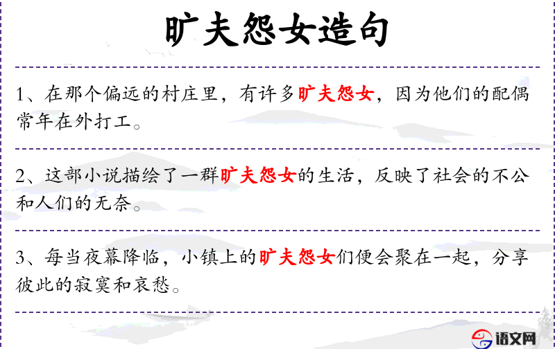 - 在诗歌创作中,“旷夫怨女”常被用来表达对远方亲人的思念以及对和平生活的向往。