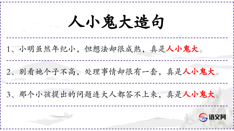 - 成语“人小鬼大”源自民间,反映了**人对孩子聪明才智的赞赏。