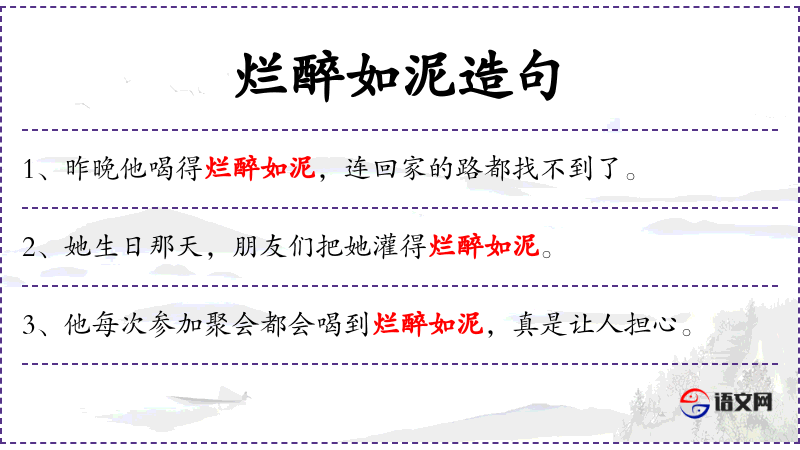 2. 【烂醉如泥】 - 醉得瘫成一团,扶都扶不住。形容大醉的样子。