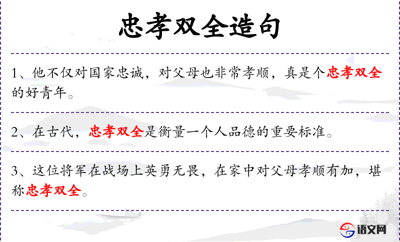 - 忠孝双全:指既忠诚于国家或君主,又孝顺父母,是**传统文化中的美德。