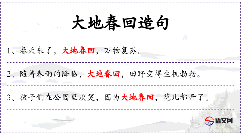 1. 【大地春回】 指冬去春来,草木萌生,大地上出现一片生机景象。有时亦用比喻形势好转。