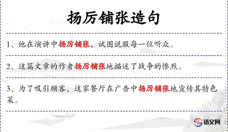 - 状语:在小说中、扬厉铺张地