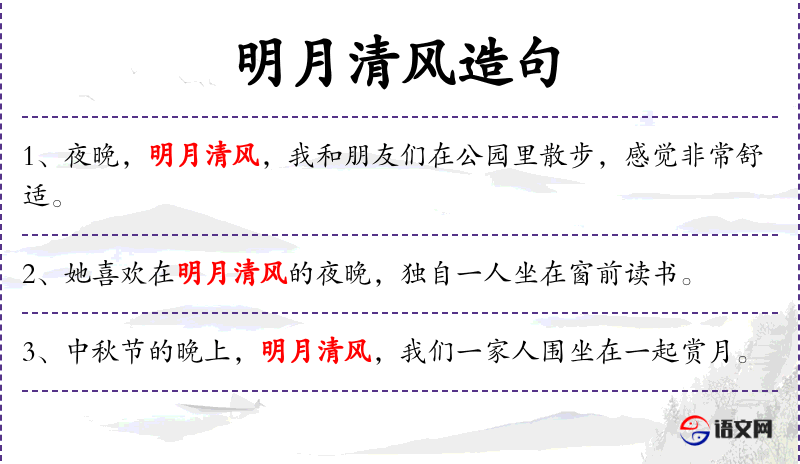- 相关成语:“明月清风”可以联想到“清风明月”,形容环境宁静美好。