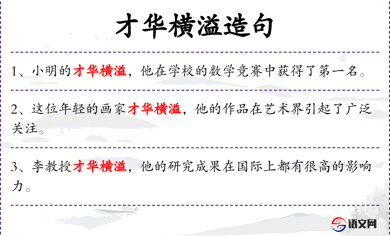 3. 【才华横溢】 才华:表现于外的才能。多指文学艺术方面而言,很有才华。