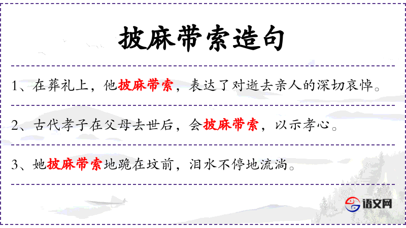 - 披麻带索:形容极度悲伤或哀悼的状态,通常在丧葬仪式中使用。
