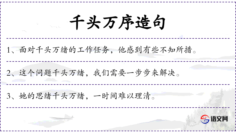 3. 【千头万绪】 绪:丝头。比喻事情的开端,头绪非常多。也形容事情复杂纷乱。
