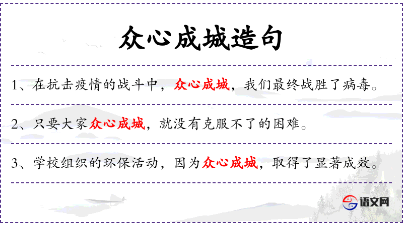- 众心成城:这是一个成语,意思是大家团结一致,力量就会像城墙一样坚固。