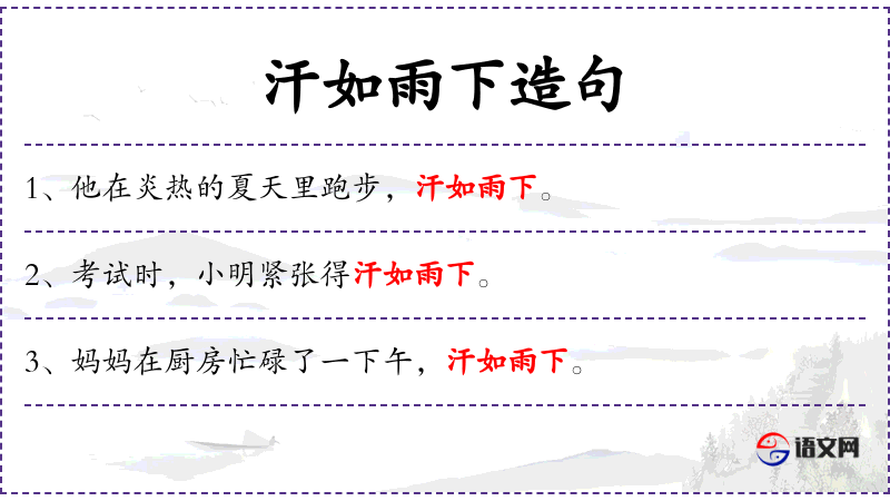 2. 【汗如雨下】 汗珠象下雨似的往下掉。形容出汗很多。
