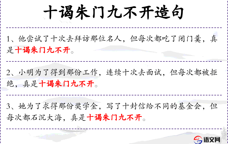 - 文化背景中,成语“十谒朱门九不开”强调了多次尝试但多数失败的情境,与**文化中对坚持和运气的看法有关。
