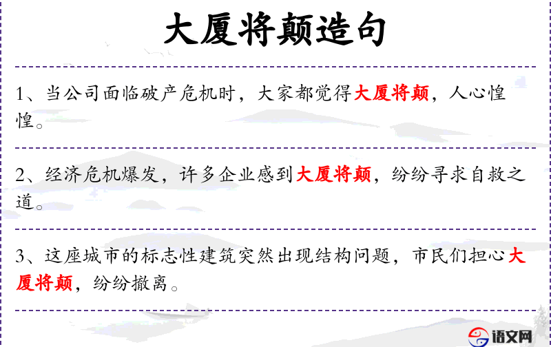 - 由于一场突如其来的地震,城市的高楼大厦开始摇摇欲坠,引发了人们的惊恐,他们担心大厦即将倾覆。