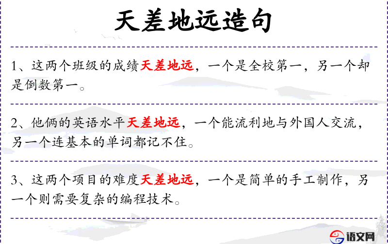 - 天差地远:截然不同、迥然不同