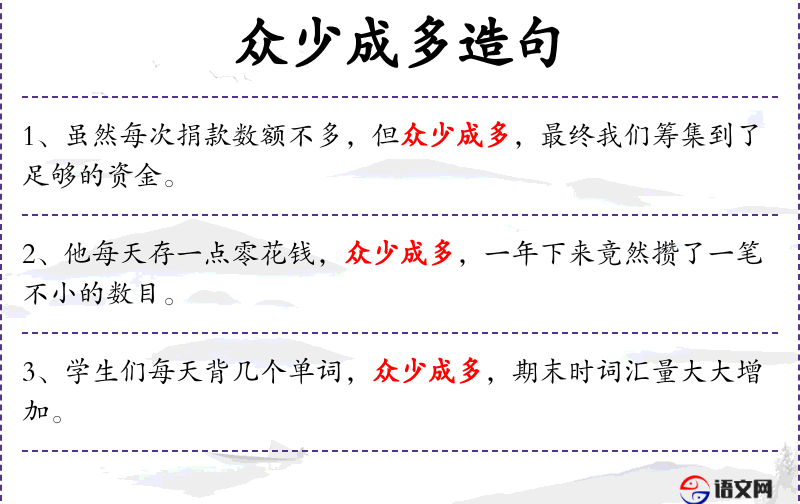 - 众少成多:成语,意思是少量积累可以变成大量。