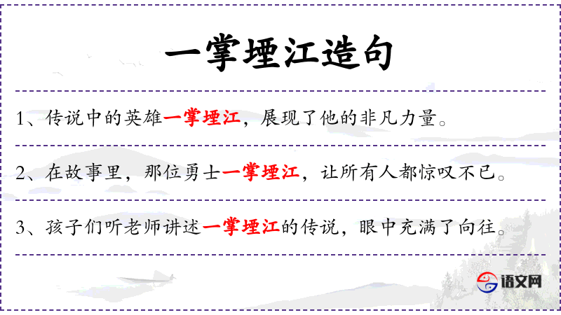 - 英文:In history class, we learned the origin of the idiom "一掌堙江".
