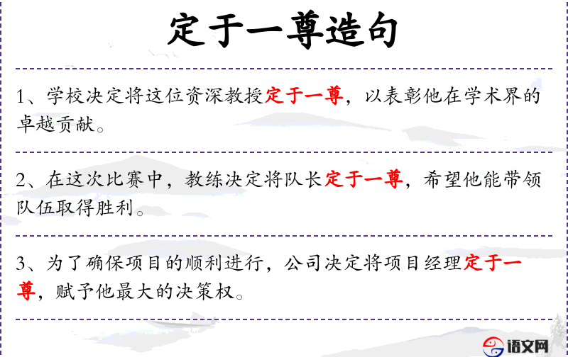 - 相关成语:“定于”源自古代政治文化,意为使某人或某物成为独一无二、至高无上的存在。