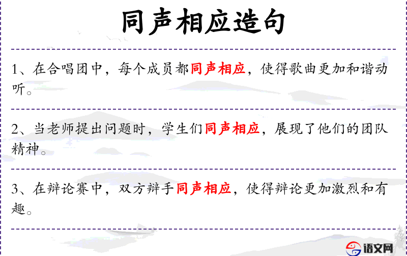 句子:“在合唱团中,每个成员都同声相应,使得歌曲更加和谐动听。”