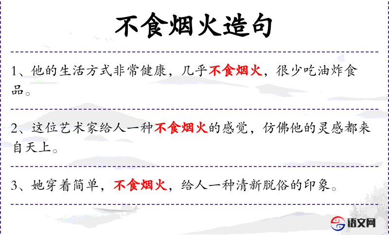 1. 【不食烟火】 - ①指不吃熟食。道家修炼主张绝粒却谷,不吃世间烟火物。②指诗文立意高超,言词清丽,不同凡俗。